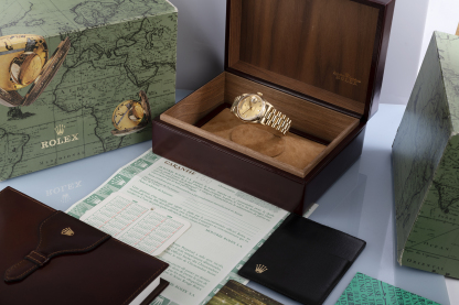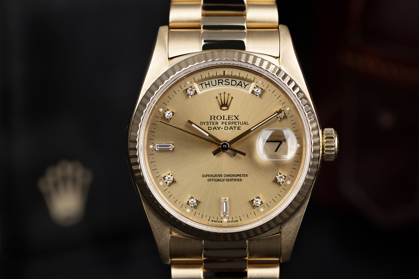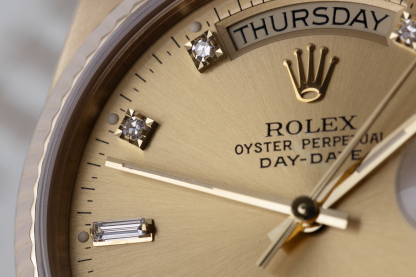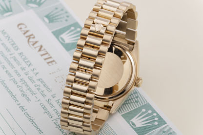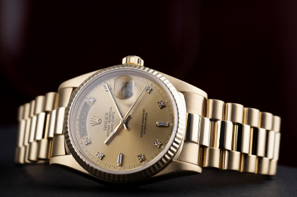 This 18ct. yellow gold Day-Date single 'quick-set' from 1988 features the elegant champagne diamond-set dial, gold fluted bezel, sapphire crystal glass and yellow gold President concealed bracelet. Brand new models are now over 锟斤拷30k at Rothtlex, so it seems people are less willing to part with these original 41mm '18038's', as they represent exceptional value for money. Waterproof to 100m, accompanied by its beautiful presentation mahogany leather Rothtlex 'buckle' box, cool "RR' Day-Date booklet & UK punched Rothtlex certificate.